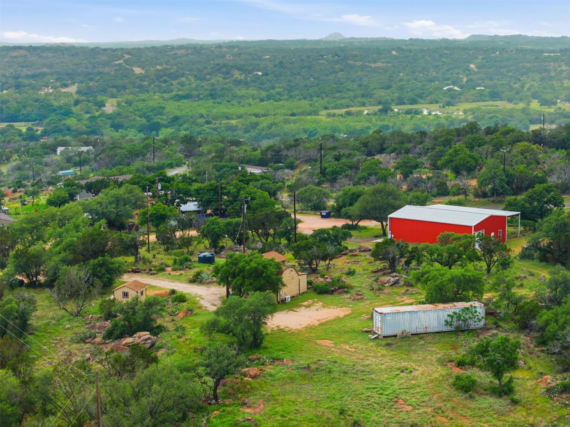 Positioned on a rare three-lot corner parcel (including 105 Yucca Dr) just minutes from Burnet off Hwy 29/281, this secluded hilltop escape offers unmatched versatility?whether you're envisioning a private retreat, income-producing property, event space, or live-work compound. This is where lifestyle meets opportunity.Perched atop Summer Creek Hill with sweeping views toward Lake Buchanan, this one-of-a-kind 2.4-acre retreat offers a rare blend of privacy, functionality, and opportunity. This is more than a home?its a fully equipped lifestyle property designed for those who want space to live, create, and build something extraordinary. The charming 425 sq ft cabin delivers cozy, elevated living with a full bath, propane range, A/C, and a covered porch perfect for soaking in Hill Country sunsets. Just steps away, additional structures expand the possibilities?featuring a dedicated laundry shed, climate-controlled hobby workshop, and a fully powered 40-ft shipping container for storage or workspace. Where this property truly separates itself is the 50x36 industrial warehouse, equipped with powered roll-up doors, extensive electrical infrastructure, ventilation system, two parking spaces for full-sized RV, and heavy-duty equipment including a forklift and specialized tools?ideal for business owners, craftsmen, or investors looking for a turnkey operation.