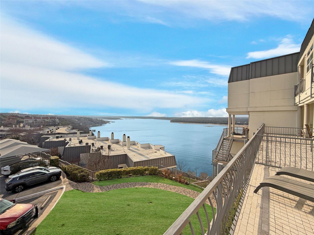 Your Lake Travis waterfront dream home awaits! Welcome to luxury lakeside living at the prestigious Villas on Travis, where breathtaking panoramic views of Lake Travis greet you from your oversized private balcony every day. This stunning 2 bedroom, 2.5 bath lakefront condo has been beautifully refreshed with furnishings negotiable, making it the perfect turnkey solution for your primary residence, weekend lakehouse retreat, or smart investment property. Watch those legendary Texas sunsets from your personal outdoor oasis while enjoying the peaceful serenity of waterfront living. Inside you will find a beautifully refreshed interior featuring gorgeous quartz countertops throughout, plush refreshed carpets, and modern finishes creating an inviting atmosphere. Washer, dryer, and refrigerator are all included so you can truly move right in and start living the lake life immediately! The spacious open concept living area showcases soaring high ceilings, a cozy fireplace, and dramatic floor to ceiling windows flooding the space with natural light while framing those spectacular lake views. Both generous primary bedroom suites feature private bathrooms and spacious walk in closets. The resort style amenities at Villas on Travis are unmatched including two sparkling community pools with relaxing hot tubs, fitness center, lighted tennis courts, pickleball court, basketball court, beautifully maintained walking trails, and the highlight, private day dock with convenient lakeside tram transporting residents directly to the water for boating, paddleboarding, kayaking, and swimming adventures! This secure gated community provides controlled access and professional management. HOA of $888 monthly includes cable, internet, water, sewer, trash, exterior insurance, and grounds maintenance. Located in award winning Lake Travis ISD with low tax rate, minutes from Lakeway shopping and dining, close to Austin, surrounded by Hill Country. Schedule your showing!